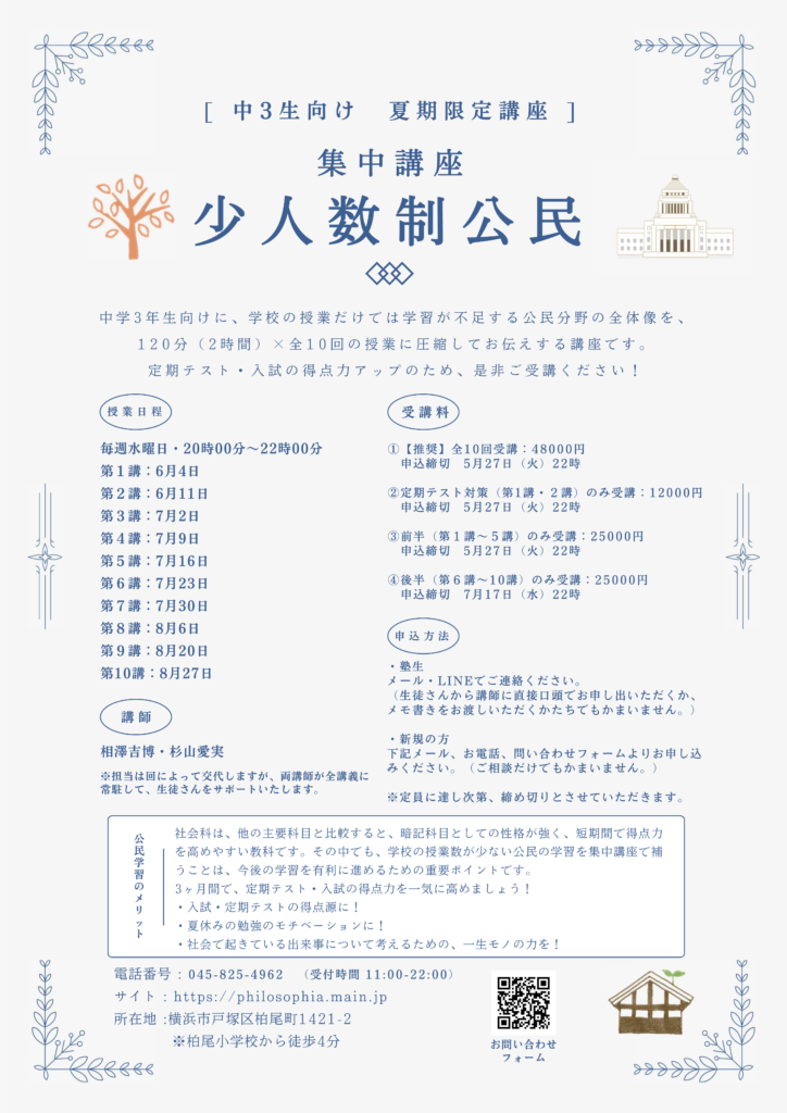 【満席・締切】夏期限定の集中講座「少人数制公民」受講生募集中です!